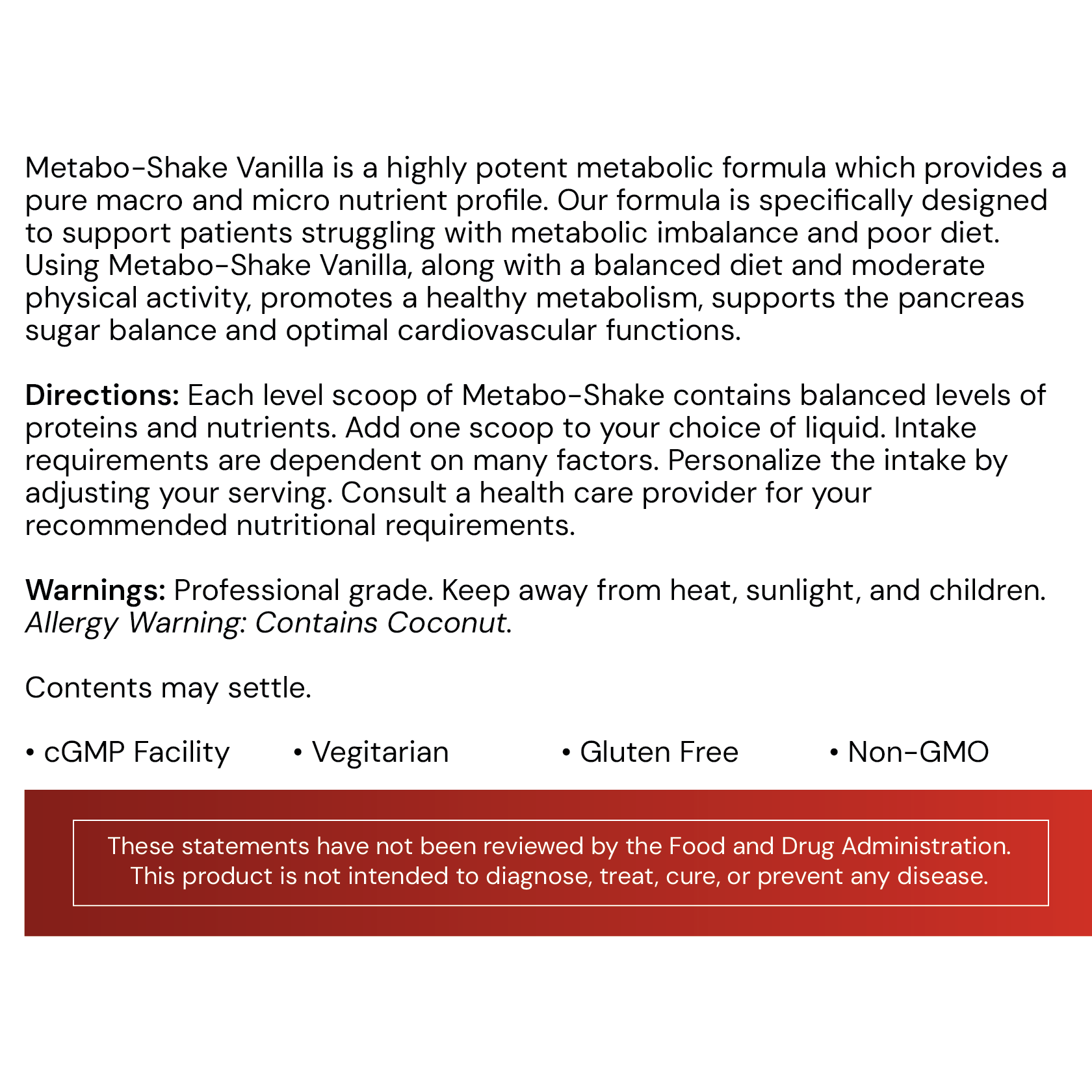 Each level scoop of Metabo-Shake contains balanced levels of proteins and nutrients. Add one scoop to your choice of liquid. Intake requirements are dependent on many factors. Personalize the intake by adjusting your serving. Consult a health care provider for your recommended nutritional requirements.